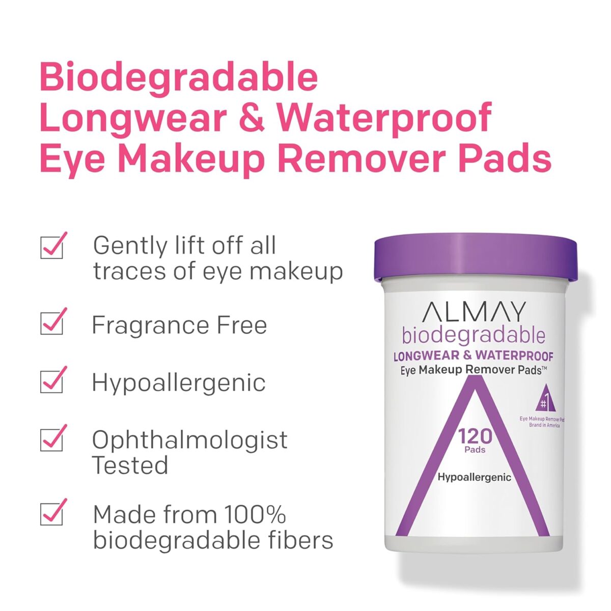 Almay Biodegradable Makeup Remover Pads, Longwear & Waterproof, Hypoallergenic, Fragrance-Free, Dermatologist & Ophthalmologist Tested, 120 count