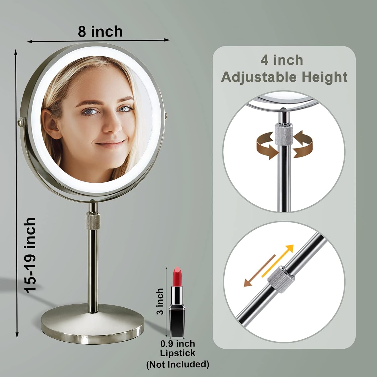 Furgatti Lighted Makeup Mirror, Vanity Mirror with 3 Color Lights, 1x/10x Magnification, 4000 mAh Adjustable Height, 8 Inch Tabletop Cosmetic Mirror with Touch Control Lights, Women Gift, Nickel
