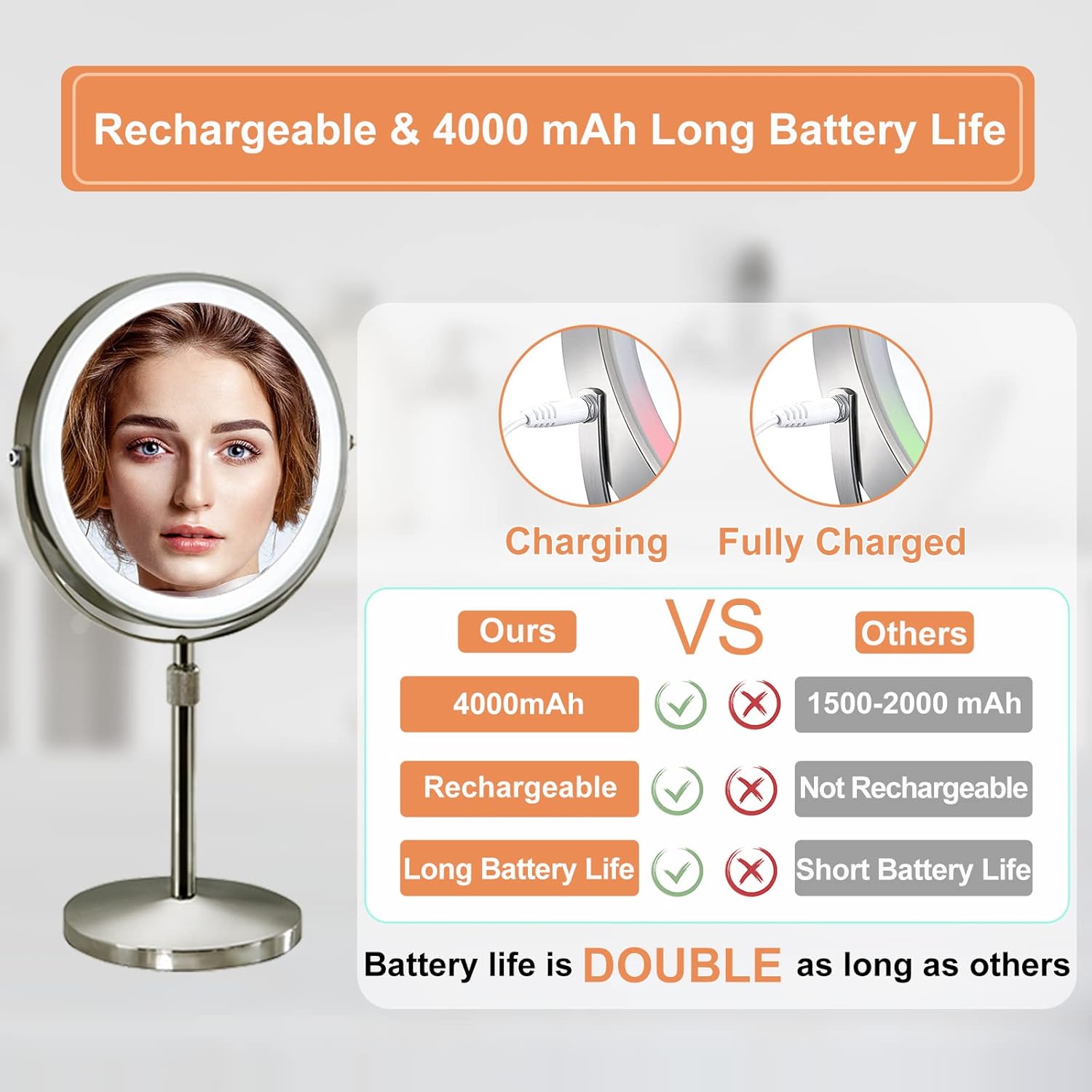- 4000 mAh Battery Make Up Mirror : Our Makeup light up mirror is with 4000 mAh Battery, which is twice the battery capacity in the market. There all are 1500 mAh, 2000 mAh or 3000 mAh in general, but ours is 4000 mAh. So our Led travel mirrrors will be no case that the electricity will run out after using a while.